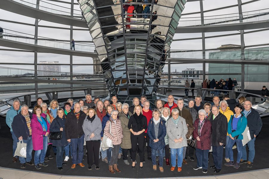 Die Gäste erlebten ein vielseitiges Programm durch die Politik- und Kulturlandschaft der Hauptstadt. Bei einem Besuch im Bundesministerium für Gesundheit erfuhren die Gäste in einem interessanten Vortrag viele Details über die zentralen Aufgaben des Ministeriums wie etwa die Sicherung und Fortentwicklung der Leistungsfähigkeit der Gesetzlichen Krankenversicherung sowie der Pflegeversicherung, die Stärkung der Interessen der Patientinnen und Patienten sowie die Gewährleistung der Wirtschaftlichkeit und Finanzierbarkeit des Gesundheitssystems, wobei sich spontan lebhafte Diskussion ergaben. Am Folgetag wurde der Besuchergruppe im Museum in der Kulturbrauerei mit der Dauerausstellung “Alltag in der DDR” eine sehr interessante und gut ausgearbeitete Ausstellung über den Alltag in der DDR geboten. Für Gäste, die in der DDR gelebt hatten, kamen Erinnerungen hoch. Für alle anderen war es einfach interessant, sich die Ausstellung genau anzuschauen, um zu erfahren, wie man in der DDR lebte und arbeitete. Nach dem Mittagessen startete auch schon der Besuch im Reichstag. Nach einem unterhaltsamen Vortrag auf der Besuchertribüne und einem ausgiebigen Gespräch mit ihrer Abgeordneten hatten die Gäste noch die Gelegenheit, auf einem Rundgang durch die Glaskuppel die fantastische Aussicht über die Bundeshauptstadt zu genießen, bevor sich die bestens gelaunte Besuchergruppe wieder auf den Weg in heimische Gefilde machte.